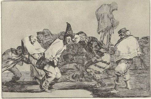 Ensor trekt erop uit. Allereerst naar Parijs samen met Jan Toorop. Daar maakt hij kennis met bekende impressionisten. Maar het is niet het verblijf in Parijs dat voor een grote omslag zal zorgen, het is vooral een bezoek in Lille waar hij met Goya kennismaakt. Hij ziet daar een reeks afbeeldingen die dwaasheden voorstellen. Hier zien we bijvoorbeeld ‘de dwaasheid van het carnaval, een prent die tussen 1815 en 1820 door Goya is getekend. Kijk eens naar de tweede figuur van rechts. We zien een vervormd gezicht… een karikatuur.