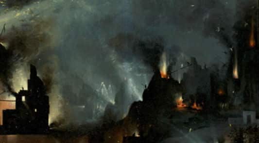 In een aantal schilderen van Jeroen Bosch zien we ook een stadsbrand. Hier het voorbeeld van zo’n voorstelling in de Tuin der Lusten. Het gaat hier om het rechter paneel dat de hel voorstelt.