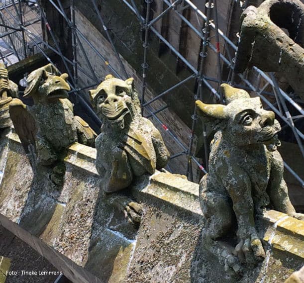 En er is nog een punt dat opvalt: de monsters. Jeroen Bosch zal vooral grote bekendheid krijgen door de fantasiefiguren die hij afbeeldt. Vaak gaat het om monsters en ongetwijfeld heeft hij die monsters voor het eerst op het dak van de St. Jan gezien. De foto toont enkele van die monsters en aan de hand van de volgende video maken we een kleine maar prachtige excursie.