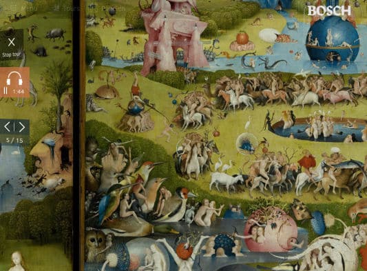 Via een audiovisuele rondleiding krijgt de bezoeker de unieke kans tot in de diepste details in te zoomen op De tuin der lusten en zo kennis te maken met de mysterieuze symboliek en de vreemde wezens in zijn wereld. De informatie is te beluisteren in zowel het Nederlands, ingesproken door Midas Dekkers, en het Engels, ingesproken door Redmond O’Hanlon. Naast de mogelijkheid het schilderij vrij te verkennen en een algemene tour te volgen, kun je ook kiezen voor de Klokhuis-tour, verteld door Nienke de La Rive Box.